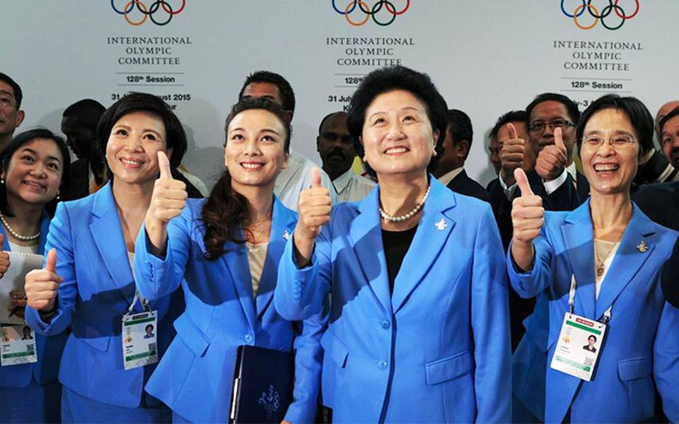 申冬奥成功后,刘延东总理与代表团成员在新闻发布会上自信的竖起大拇指